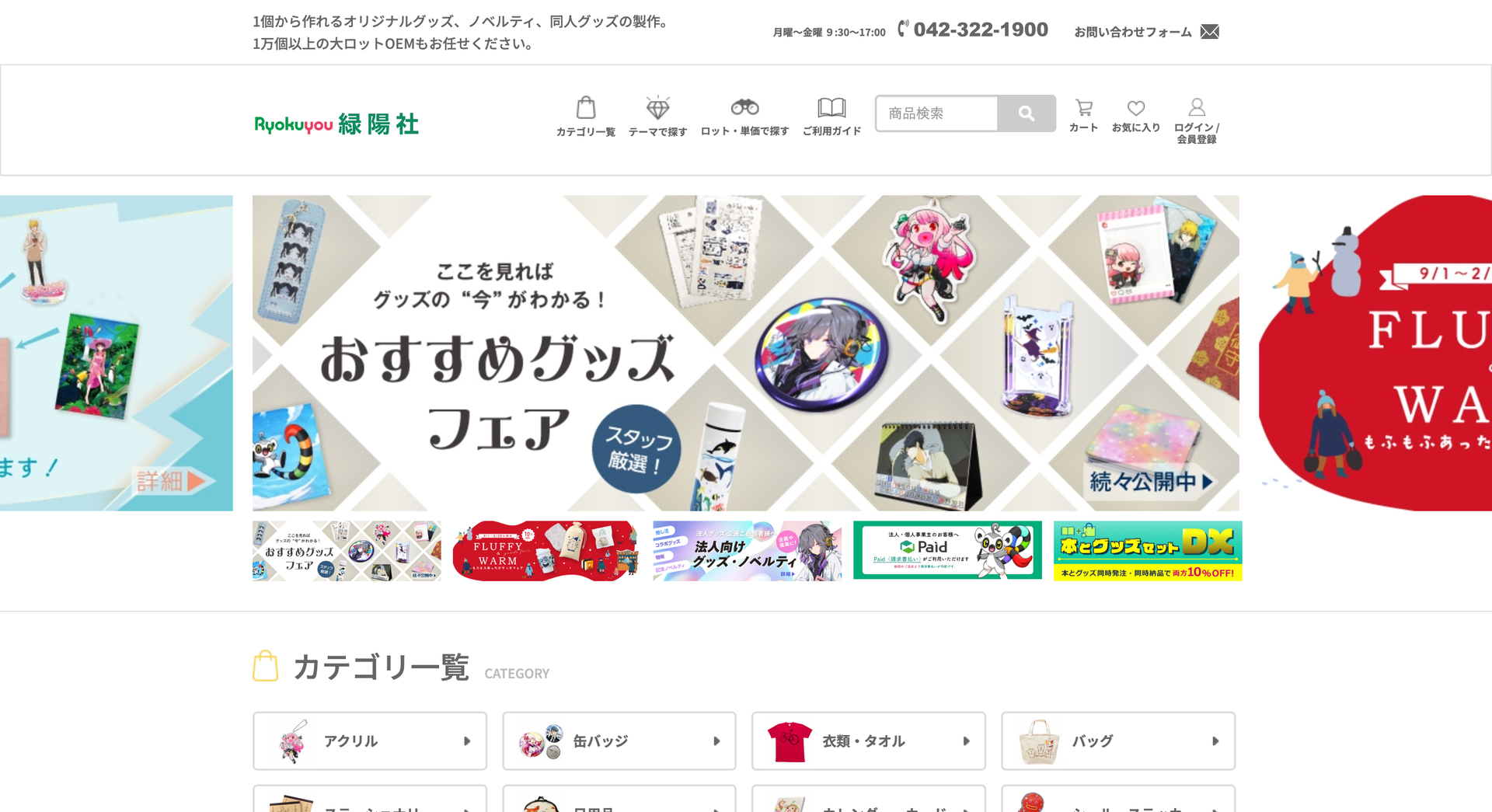 アクリルグッズ、缶バッジ、布もの、食品ノベルティまで、とにかく取り扱いアイテムの幅が広いのが緑陽社の特徴です。
